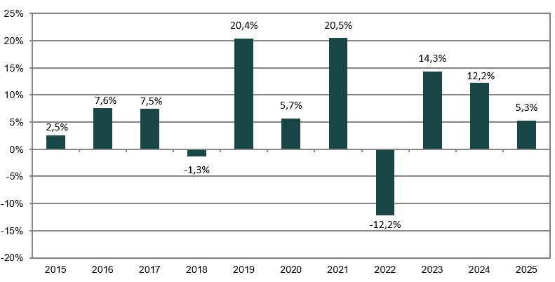 Resultatet visas efter avdrag för årliga avgifter. Eventuella tecknings- och inlösenavgifter är undantagna från beräkningen.